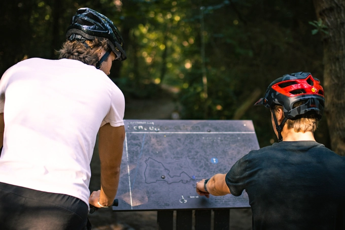 De route is gemarkeerd met houten palen met daarop in het blauw het internationale MTB-teken (driehoek met daaronder 2 rondjes) en het logo van een fiets.